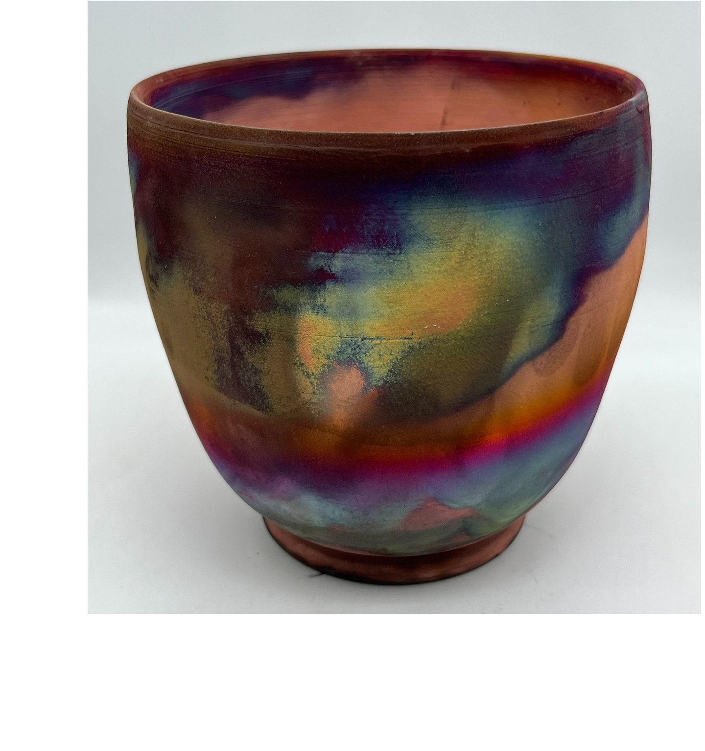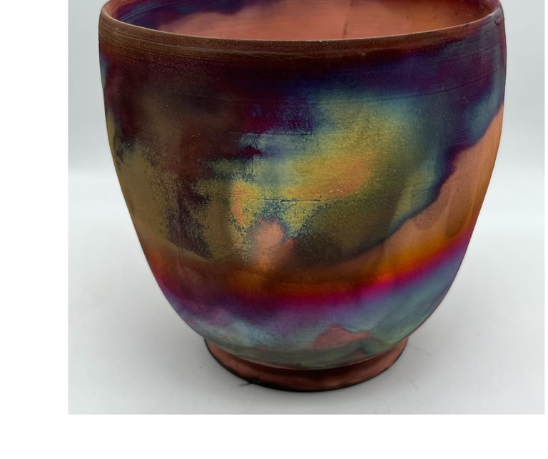 The copper matte pots I make start with a type of clay called Ashraf Hanna. They are formed into the shape I require on the potter’s wheel, and left to dry for about 7-14 days. Once dry ('leather hard') the pot is fired in an electric kiln to 980 degrees Centigrade. This process is known as a 'Bisque fire' and turns the pot into ceramic so instead of crumbling it would now smash if you dropped it. The Raku firing is the next step. The pot is coated in a mixture of copper oxide and water and left to dry before being placed into a gas-fired kiln and slowly heated to just over 1000 degrees Centigrade for about 45 minutes to an hour.